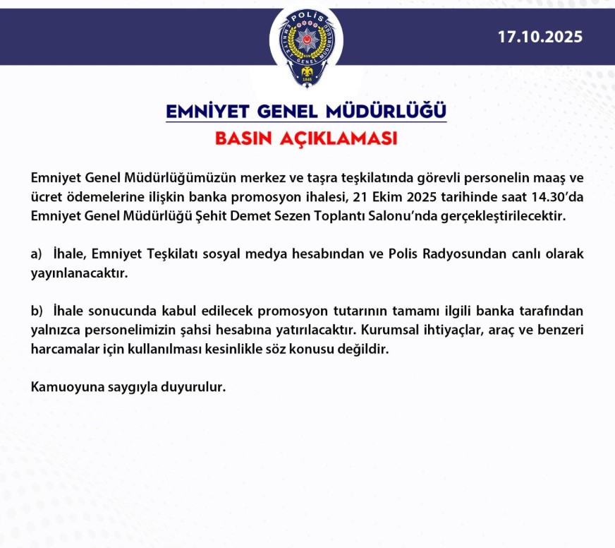 “Emniyet Genel Müdürlüğümüzün merkez ve taşra teşkilatında görevli personelin maaş ve ücret ödemelerine ilişkin banka promosyon ihalesi, 21 Ekim 2025 tarihinde saat 14.30’da Emniyet Genel Müdürlüğü Şehit Demet Sezen Toplantı Salonu’nda gerçekleştirilecektir.