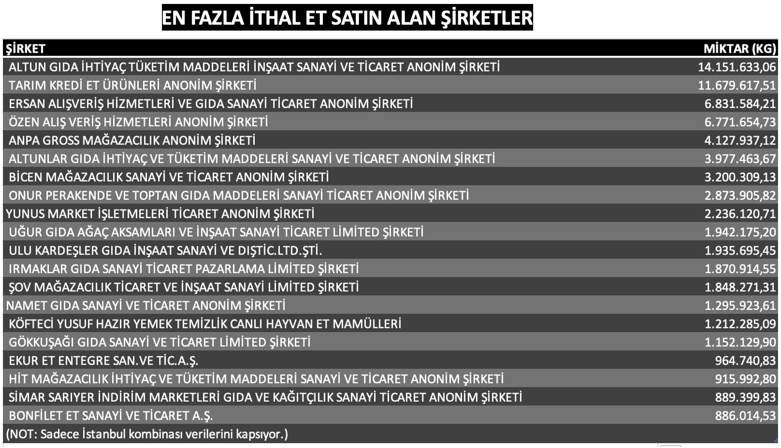 Söz konusu rakamın yaklaşık yarısı, piyasada önemli pazar payını elinde bulunduran 7 market zinciri arasında dağıtılırken, ESK’nın en fazla et ithalatı gerçekleştirdiği restoran zinciri ise Köfteci Yusuf oldu.